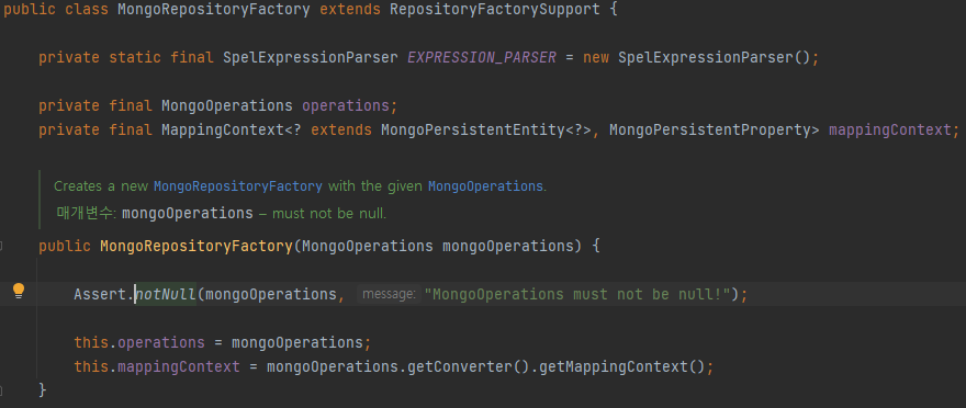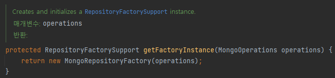 위 코드를 보면 MongoOperations는 반드시 존재해야 하며, MongoRepositoryFactoryBean에서 MongoRepositoryFactory를 생성하는 코드를 살펴봐도 동일하게 자신이 가지고 있던 MongoOperations를 파라미터로써 넘겨주는 모습을 볼 수 있다.