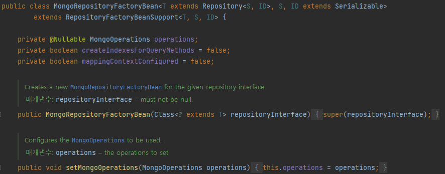 주의할 점은 mongoTemplate을 등록하는 과정이다. MongoRepositoryFactoryBean에 들어가 보면 MongoOperations는 분명 'operations'라는 변수명으로 등록되어 있다. 그래서 당연히 이렇게 하는겠거니 하며 등록했었다.