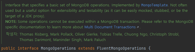 위 javadoc의 첫 문장을 보면 MongoTemplate에 의해서 구현된다고 적혀있다. 즉, MongoTemplate을 생성해서 위의 MongoRepositoryFactoryBean의 생성 시 함께 세팅해서 넣어줘야 하는 것이다. 그렇다면 MongoTemplate은 무엇일까?