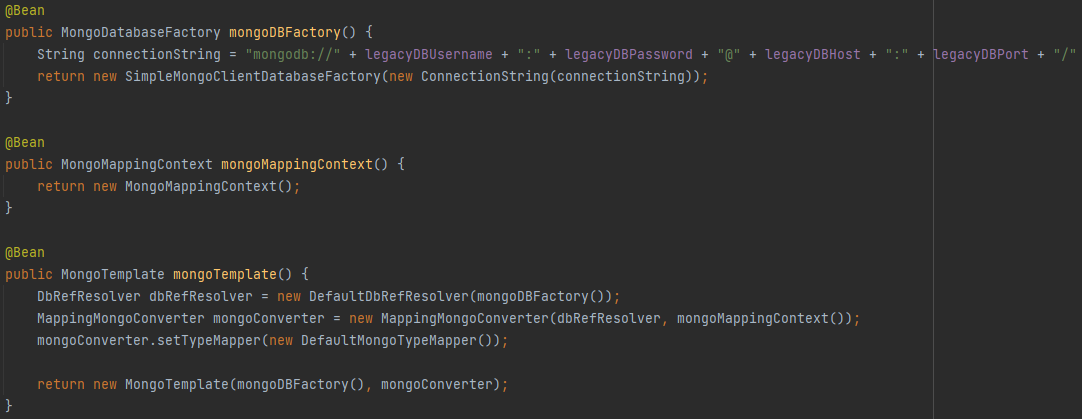 이렇게 Configuration 코드를 세팅해서 등록해주면, 사용하고자 했던 MongoTemplate이 Bean으로 등록된다. 때문에 이제 MongoTemplate이 필요한 부분에 이를 추가해주면 된다.